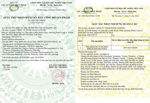 Biken Kinase Gold là sản phẩm được sản xuất và phân phối hợp pháp tại Việt Nam, đã đạt được giấy phép quảng cáo của Cục An toàn thực phẩm – Bộ Y tế.