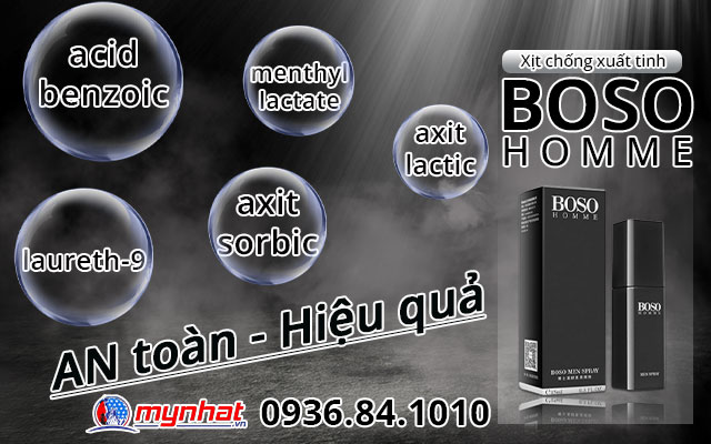 Sản phẩm chống xuất tinh sớm Boso Homme Men Spray được nhiều nam giới ưa chuộng bởi chất lượng cùng độ hiệu quả rõ rệt, ngoài ra thì còn có các công dụng khác như: