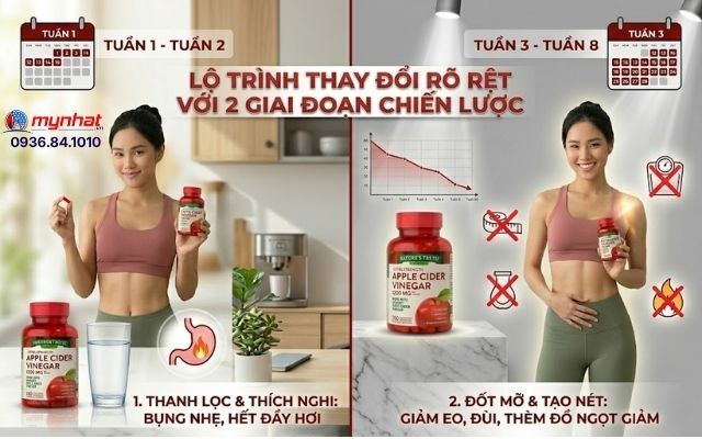 Giai đoạn 2 (Tuần 3 - Tuần 8): Đốt mỡ & Tạo nét. Đây là giai đoạn Acid Acetic tấn công vào các mô mỡ thừa. Các chỉ số vòng eo, vòng đùi sẽ bắt đầu giảm. Cảm giác thèm đồ ngọt cũng sẽ giảm đi đáng kể.