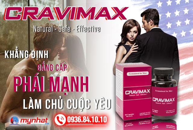 Cravimax là viên uống tăng cường sinh lý có nguồn gốc từ Hoa Kỳ. Có tác dụng hỗ trợ nam giới điều trị xuất tinh sớm, tăng cường sức khỏe và cải thiện tần suất khi quan hệ tình dục. Sản phẩm được bào chế từ nhiều loại thảo dược quý hiếm cùng với đó là quy trình chọn lọc kỹ lưỡng của các gia hàng đầu Hoa Kỳ để cho ra được viên uống có chất lượng tốt nhất cho người tiêu dùng.