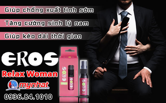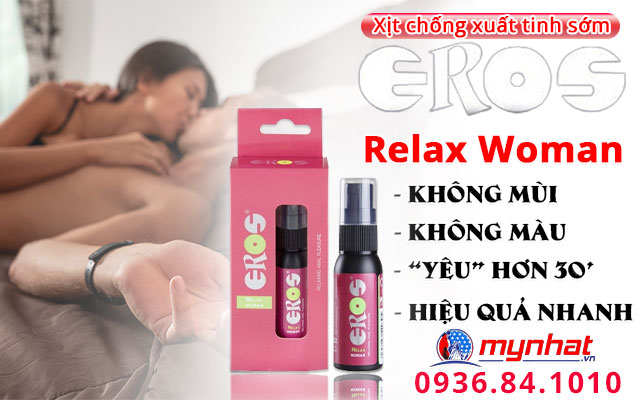 Eros Relax Woman là sản phẩm tăng cường sinh lý nam, chống xuất tinh sớm và kéo dài thời gian quan hệ cho nam. Sản phẩm này được nghiên cứu và đặc chế theo công thức độc quyền của hãng Eros của Đức. Chai xịt được nhiều nam giới ưa chuộng bởi chất lượng cùng độ hiệu quả nhanh chóng, giúp nam giới xua tan nỗi lo xuất tinh sớm và đã có mặt tại nhiều quốc gia khác nhau.