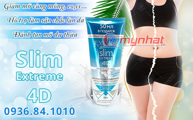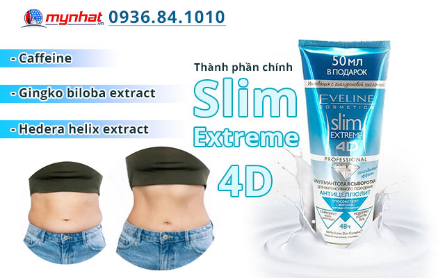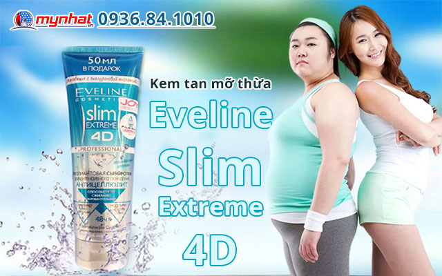 Eveline Slim Extreme 4D là sản phẩm hỗ trợ đốt cháy mỡ thừa, làm tan mỡ thừa tích tụ dưới các lớp da, được sản xuất dưới dạng kem tan mỡ và được nhập khẩu từ Nga. Sản phẩm nhờ kết hợp công nghệ 4D, tinh chất tác động 4 chiều trên làn da: làm giảm tế bào ở các mô mỡ và tế bào da chết, giúp kích thích vi tuần hoàn tái tạo da, định hình các đường cong trên cơ thể để cho ra một thân hình săn chắc, thon gọn hơn.