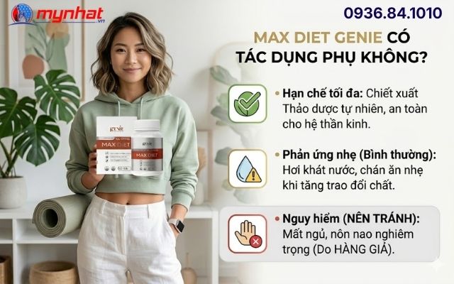 Một trong những nỗi sợ lớn nhất của người dùng là tình trạng mất ngủ, nôn nao hay tiêu chảy kéo dài. Vậy thực tế Max Diet Genie có tác dụng phụ không? Câu trả lời nằm ở sự minh bạch của bảng thành phần. Vì được chiết xuất hoàn toàn từ thảo dược tự nhiên, sản phẩm hạn chế tối đa các tác động tiêu cực lên hệ thần kinh trung ương.