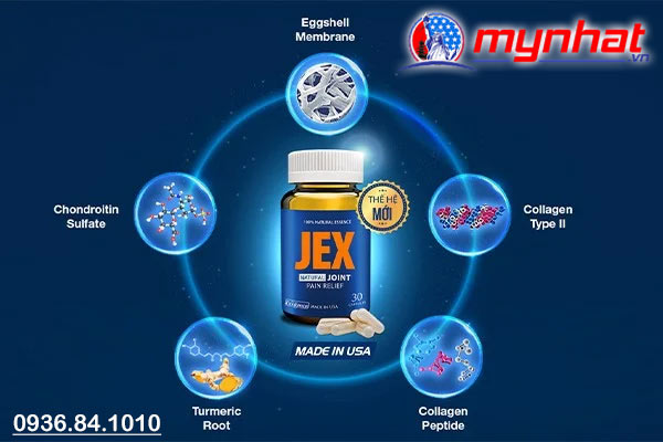 JEX bao gồm Collagen Peptide và các thành phần quý từ thiên nhiên như White Willow Bark, Chondroitin Sulfate, Turmeric, giúp giảm cảm giác đau, thúc đẩy quá trình tái tạo của cả sụn khớp và phần xương dưới sụn, đồng thời tăng cường độ bền và tính dẻo dai cho khớp. Sản phẩm được sản xuất tại đất nước Mỹ.