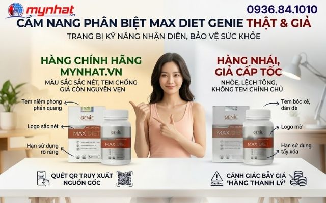 Để trở thành một người tiêu dùng thông thái, bạn cần trang bị cho mình những kỹ năng nhận diện sản phẩm chuyên sâu. Các đối tượng làm giả hiện nay vô cùng tinh vi, nhưng chúng vẫn thường để lộ những lỗ hổng mà mắt thường có thể quan sát được nếu chúng ta thực sự chú ý. Cách phân biệt Max Diet Genie thật và giả bắt đầu từ việc quan sát bao bì: Hàng chính hãng tại mynhat.vn luôn có màu sắc in ấn sắc nét, không bị nhòe hay lệch tông. Các thông tin về logo, hạn sử dụng và thành phần phải được in rõ ràng, không có dấu hiệu tẩy xóa.