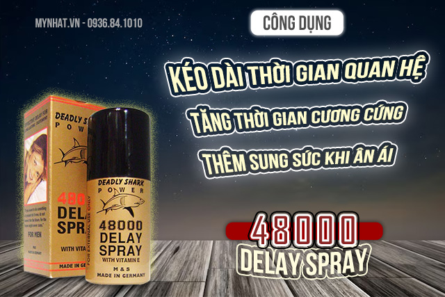48000 Delay Spray là một sản phẩm chai xịt chống xuất tinh sớm được phát triển để kéo dài thời gian quan hệ tình dục. Sản phẩm có dung tích 45ml và có thể sử dụng khoảng 100 lần. Với mùi thơm nhẹ nhàng, 48000 Delay Spray không gây tác dụng phụ đáng chú ý.