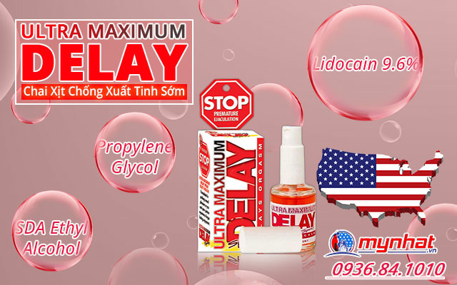 Ultra Maximum Delay Spray là sản phẩm hỗ trợ tăng cường sinh lý dành cho giới được sản xuất dưới dạng chai xịt và được nhập khẩu từ Mỹ. Sản phẩm này hỗ trợ nam giới cải thiện nhanh tình trạng xuất tinh sớm, với hợp chất gây tê nhẹ tự nhiên làm trì hoãn thời gian đạt cực khoái để nam giới dễ dàng duy trì cuộc yêu theo ý muốn.
