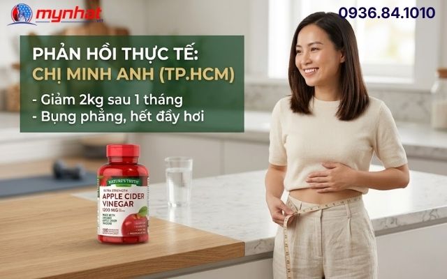 Chị Minh Anh (32 tuổi, TP.HCM) chia sẻ: "Mình từng thử uống dấm táo nước nhưng không chịu nổi mùi. Chuyển sang viên uống Nature's Truth của Mỹ thì thấy nhẹ nhàng hẳn. Sau 1 tháng dùng đều đặn kết hợp đi bộ, mình giảm được 2kg, quan trọng nhất là bụng dưới phẳng hẳn ra, không còn bị đầy hơi mỗi chiều."