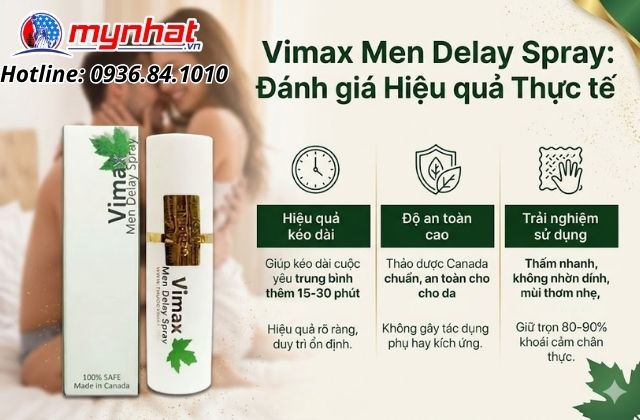 Vimax Men Delay Spray là dung dịch xịt hỗ trợ nam giới cải thiện thời gian quan hệ, thuộc hệ sinh thái sản phẩm cao cấp của thương hiệu Vimax từ Canada. Đây là dòng sản phẩm tiên phong trong việc ứng dụng các hoạt chất thảo dược tự nhiên để thay thế cho hợp chất gây tê tổng hợp nồng độ cao, giúp bảo vệ sức khỏe người dùng lâu dài.
